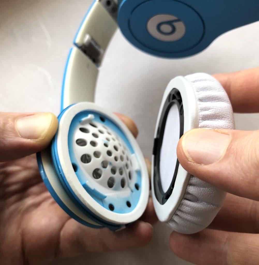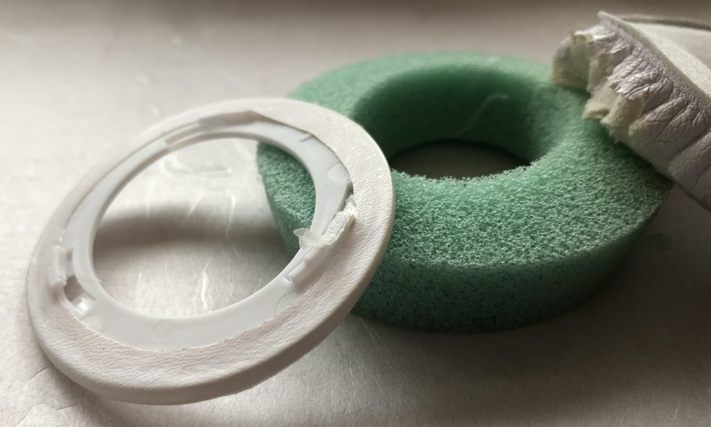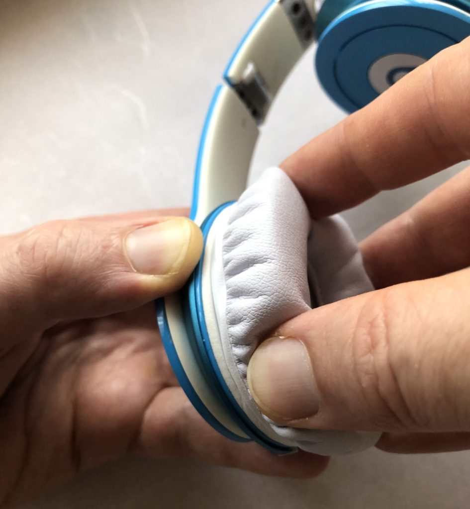 Headphone with connective flat ring still attached (locked) to the speaker. ヘッドフォンのスピーカー部分にパッドの平らでで丸いプラスチック部分がそのままくっついている状態です。Soak the cotton swab with glue remover, then release a drop portion into the glued lock system (3 locations). After one minute or so, try to move the flat plastic ring counter clockwise by firmly holding the speaker. If necessary, repeat this procedure. Avoid spilling of glue remover into the speaker to avoid damage. 綿棒をシール剥がし液で濡らして、フック部分の3箇所に一滴ぐらいずつ垂らしましょう。約1分間後、反時計回りに平らな白いプラスチック部分を動かします。その時には、スピーカーをしっかり固定して持ちましょう。必要に応じてこの手順を繰り返してください。シール剥がし液を垂らしすぎてスピーカーの中に液体が入らないように気をつけてください。I proceeded by putting on the new pads without removing the glue. (It might be worth removing the remaining glue resin… however it worked fine for me without.) 私の場合、平らな白いプラスチック部分を取り外してから、すぐに新しいイヤーパッドを取り付けることができました。(私は、残ったボンドを取り除く必要はありませんでしたが、状況に応じてきれいにしてください。)The old ear pad in parts after removal. 外した古いパッドの各パーツです。Now it’s time for the new ear pads to shine… さあ、新しいパッドをつけましょう。Hold the speaker firmly. Align the new ear pad so to lock in by a short clockwise movement. スピーカー部分をしっかり持ち、ロック部分を合わせて時計回りに少しまわしましょう。Push against the speaker, then turn clockwise to lock in the new pad. Best if you apply even pressure on all 3 hooks by placing 3 fingers on those locations on the pad. 新しいイヤーパッドをスピーカー部分にしっかり合わせて、時計回りにまわして固定します。フックがある3箇所をそれぞれ指で押さえて、等しい圧力をかけてください。Done! Congratulations. Please leave a message below if you like. これで完成です!うまくいきましたか?おめでとうございます!