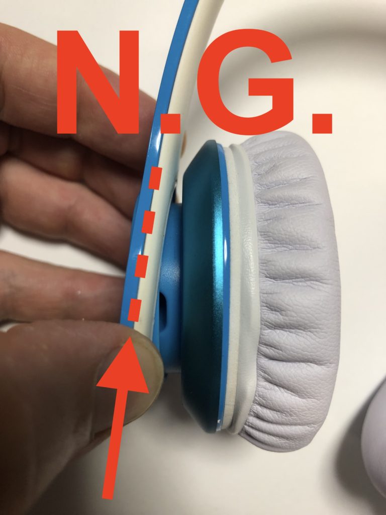 Don’t hold at the headband part. This may lead to break the flexible joints to the speaker (and even cut the electrical cord inside). 上の写真のように、ヘッドバンドの部分を持たないでください。イヤーパッドを取り付けるスピーカー部分のbと書いてある丸い部分(可動性のあるところ)が壊れる原因となります(内側にある電線も壊れてしまいます)。
