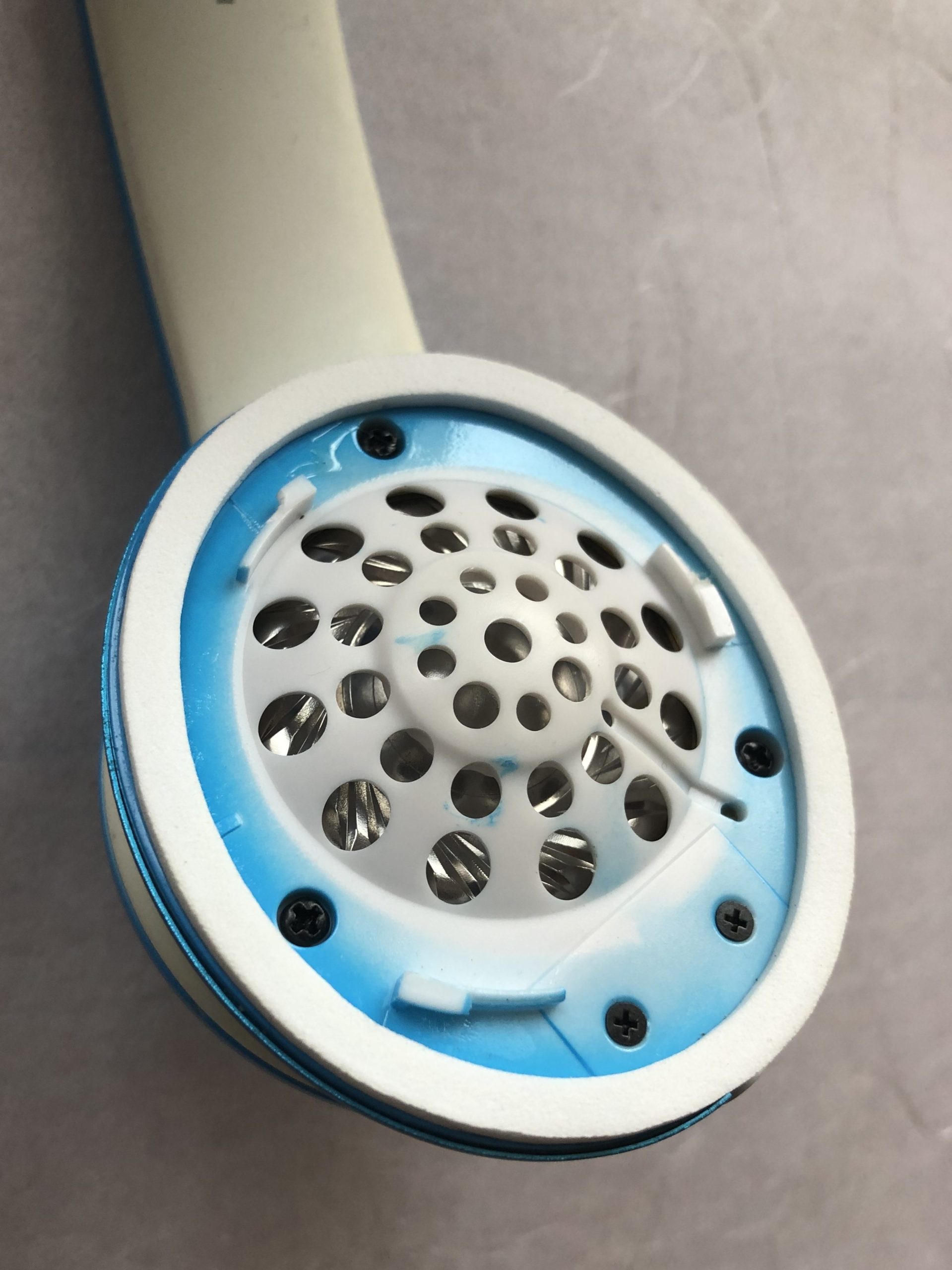 Hold firmly the speaker just below the attached foam ring. 上の写真のように、ブルーのスピーカーの部分を持ちましょう。
